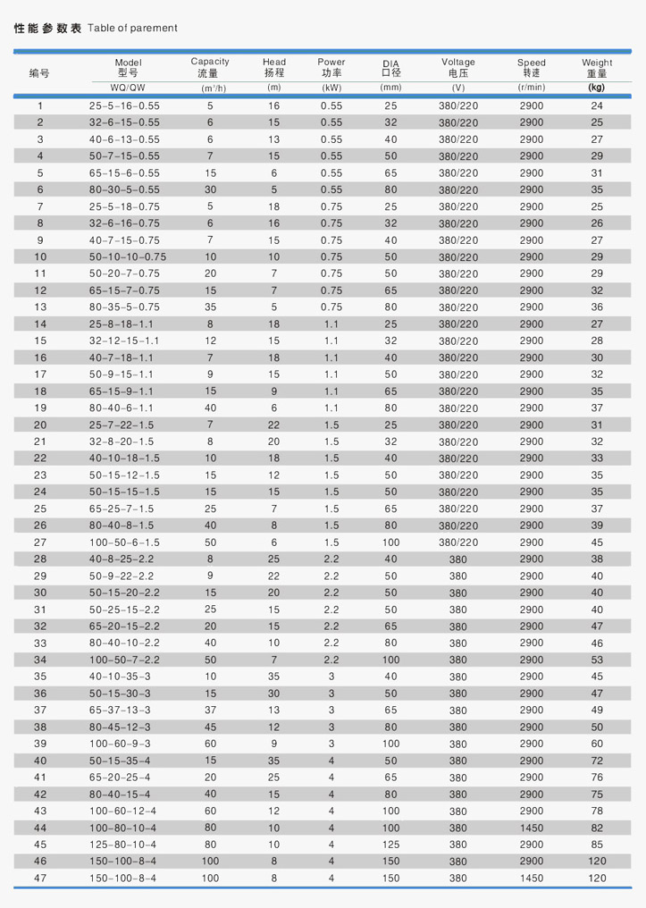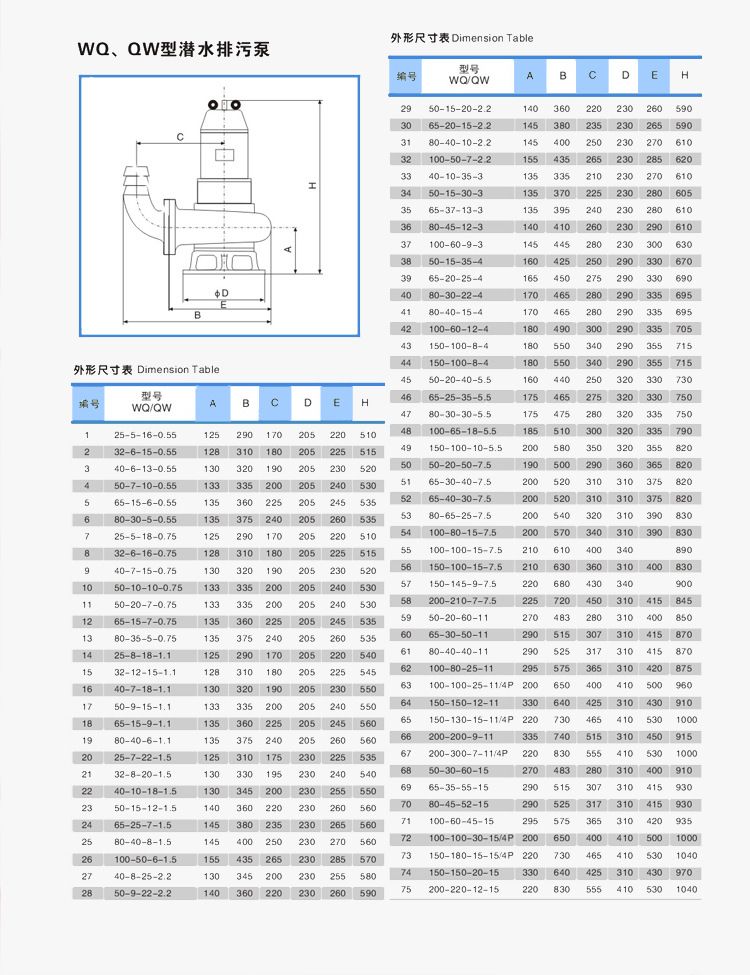 50WQ15-15-1.5立式排污水潛水泵又稱(無堵塞潛水排污泵)是在引用國內先進技術的基礎上,結合國內水泵的使用特點而研制成功的新一代泵類產品,無堵塞潛水排污泵具有節能效果顯著、防纏繞、無堵塞、自動安裝和自動控制等特點。在排送固體顆粒和長纖維垃圾方面,具有獨特效果。該系列排污泵采用獨特葉輪結構和新型機械密封,能有效地輸送含有固體物和長纖維的介質。葉輪與傳統葉輪相比,該泵葉輪采用單流道或雙流道形式,它類似于一截面大小相同的彎管,具有非常好的過流性,配以合理的蝸室,使得該泵具有效率高、葉輪經動靜平衡試驗,使泵在運行中無振動。
