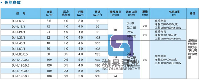 產品介紹 DJL150/0.3耐腐蝕隔膜計量泵是由電機驅動的機械隔膜計量泵,適用于底壓力場合的流體精確計量,有多種材質泵頭可選,膜片統一采用多層復合PTFE材質。因其具有很高的計量精度和穩定性能及極高的使用工求,而廣泛應用于污水處理,食品劑添加,各種特殊介質的輸送。 DJL150/0.3耐腐蝕隔膜計量泵工作條件: 流量范圍:0-500L/H 壓力范圍:0-1.0MPa 驅動方式:電機驅動 控制方式:手動、自動控制 環境溫度: -30℃ ---60℃ 電機: 二相、三相標準電機或防爆電機 功率:40W,60W 防護等級:IP54 材料: 計量泵頭: 聚氯乙烯、SUS304、SUS316、聚四氟乙烯 計量閥: 聚氯乙烯、SUS304、SUS316、聚四氟乙烯 閥球: 二氧化硅、SUS304、SUS316、陶瓷 密封: 聚四氟乙烯、聚氯乙烯。 DJL150/0.3耐腐蝕隔膜計量泵產品特點: 構造上,完全無泄露。 可用PVC、PTFE、PVDF、304不銹鋼、316不銹鋼等作為泵頭材料。 適用于各種耐酸堿藥液。 可以安裝于藥槽上。 安裝容易、維修、保養簡便。 操作安全性能高。 運轉中流量隨意調整。 ![]() 因產品生產批次、型號不同,產品圖片及安裝尺寸僅供參考,詳情可聯系我們的銷售人員了解更多DJL150/0.3耐腐蝕隔膜計量泵相關信息!