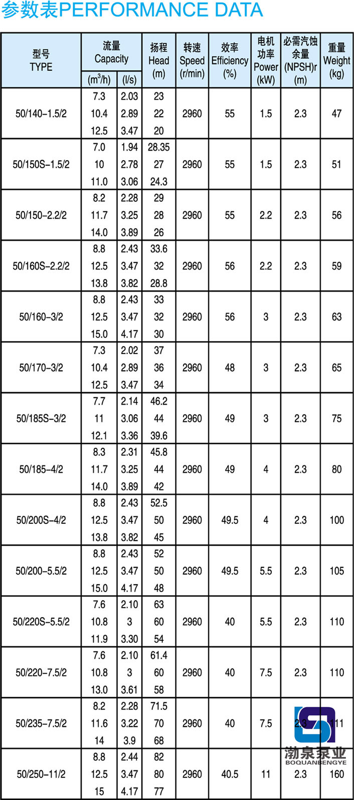 產品介紹 KQL50/150-2.2/2 立式單級單吸離心泵供輸送不含固體顆粒的清水及物理化學性質類似于水的液體之用。同時根據使用溫度、介質等不同在ISG型管道離心泵基礎上派出適用熱水、高溫、腐蝕性化工泵、油泵。該產品具有同效節能、噪音低、性能穩定等特點。 用途: KQL50/150-2.2/2 立式單級單吸離心泵用于空調、采暖、衛生用水、水處理冷卻冷凍系統、液體循環和供水、增壓及灌溉等領域中無腐蝕的冷水和熱水輸送。 工作條件: 轉速:2960r/min,1480r/min或980r/min 流量范圍:1.8~2000m3/h 揚程:≤127m 介質溫度:-10℃~120℃ 環境溫度:最大+40℃;海拔高度小于1000m;相對濕度不超過95% 材質: 泵殼、泵蓋、葉輪:鑄鐵 泵軸:45#鋼鍍鉻或不銹鋼(2Cr13) 機械密封動、靜環:浸銻石墨、碳化硅 結構:結構緊湊的單級泵,適用于現代建筑物的。 產品特點: KQL50/150-2.2/2 立式單級單吸離心泵結構緊湊、合理,泵與電機直接連接,外形美觀,占地面積小效率高,閉式鑄鐵葉輪,葉輪懸臂短,機泵軸完全同心,泵運行平穩、可靠,噪音低壽命長,強制環流沖洗機械密封,免保養、無滲漏。 管道泵選型指南: 例如:KQL80/160-7.5/2 或KQW80/160-7.5 KQL標準立式單級離心泵,KQW標準臥式單級離心泵 80進出口直徑 160葉輪名義直徑 7.5/2電機功率/電機極數 ![]() ![]() 因產品生產批次、型號不同,產品圖片及安裝尺寸僅供參考,詳情可聯系我們的銷售人員了解更多KQL50/150-2.2/2 立式單級單吸離心泵相關信息!