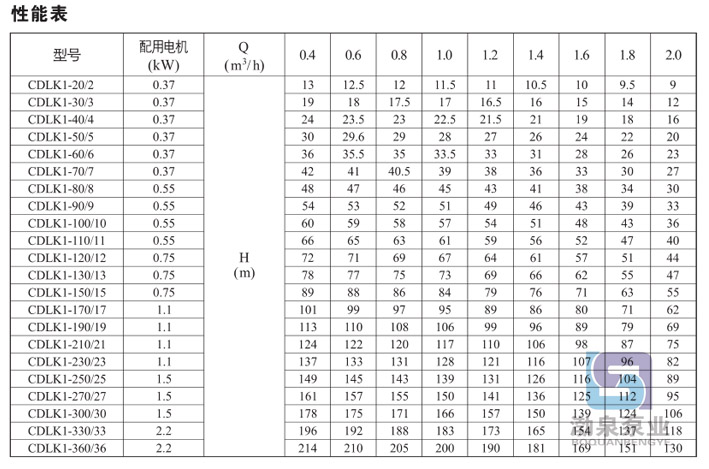 產品介紹 一、概述 CDLKF1-90/9浸入式多級離心泵為安裝標準電機 為滿足水槽或容器的安裝深度,可安裝空腔體來改變泵本身的長度,不同的級數長度見尺寸和重量表和可供產品范圍表。 二、應用范圍 CDLKF1-90/9液下式多級離心泵用于輸送機床冷卻液、潤滑液、冷凝水輸送、工業清洗設備和其它適合浸入式泵使用的場合,適合于不同溫度、流量和壓力范圍,CDLK適用于無腐蝕性液體,CDLKF適于輕度腐蝕性液體。 具體用于電火花、車床、磨床、加工中心、冷卻裝置、工業清洗設備、過濾系統等。 三、電機 電機為全封閉,風冷式二極標準電機。 防護等級:IP55 絕緣等級:F 標準電壓:50HZ:1*220-230/240V 3*200/346V 3*220-240/380-415V 3*220-225/380-440V 其他電壓的電機按要求可供。 單相電壓從0.37-2.2kw可供。 四、運行條件 CDLKF1-90/9浸入式多級離心泵適用于稀薄、干凈、不含固體顆粒和纖維的非易爆液體,可輸送水及冷卻用水溶液和切割潤滑液。 液體溫度:常溫型-15℃~+70℃ 熱水型+70℃~+120℃ ![]() 因產品生產批次、型號不同,產品圖片及安裝尺寸僅供參考,詳情可聯系我們的銷售人員了解更多CDLKF1-90/9浸入式多級離心泵相關信息!
