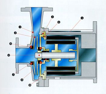 驅動裝置采用主動磁鐵聯軸器直接裝在電機軸上,泵室完全封閉,通過磁力偶合間接驅動轉子組合上的葉輪旋轉。