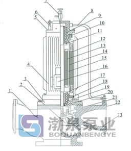 結構見圖。該泵為機泵一體結構,整機主要由泵體、葉輪、聯接體、滑動軸承、定子、轉子、屏蔽套、電機殼等零部件組成。泵為立式單級單吸離心式,進出口在同一水平軸線上,口徑規格相同可直接象閥門一樣安裝在管路的任何部位上,裝卸極為方便,占地面積省。泵通過聯接體與電機或一體,軸承采用進口石墨浸漬樹脂復合軸承,電子定轉子各有屏蔽套進行隔離。軸承采用流體本身介質作為潤滑劑及冷卻液,具有設計合理、運行可靠的特點。泵設有底座,可直接安裝在地基上,因該泵具有低噪音,無振動特點,安裝時無需加裝隔振器或隔振墊。