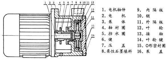 本泵采用泵與電機直聯結構,其進水口為水平方向,吐出口垂直向上。 從泵端看,泵為逆時針轉動。 葉輪可在懸臂軸上自由滑動,運轉時能自動調正葉輪二面的間隙,外隔板可借助于葉輪上的二螺孔與葉輪一起拆出