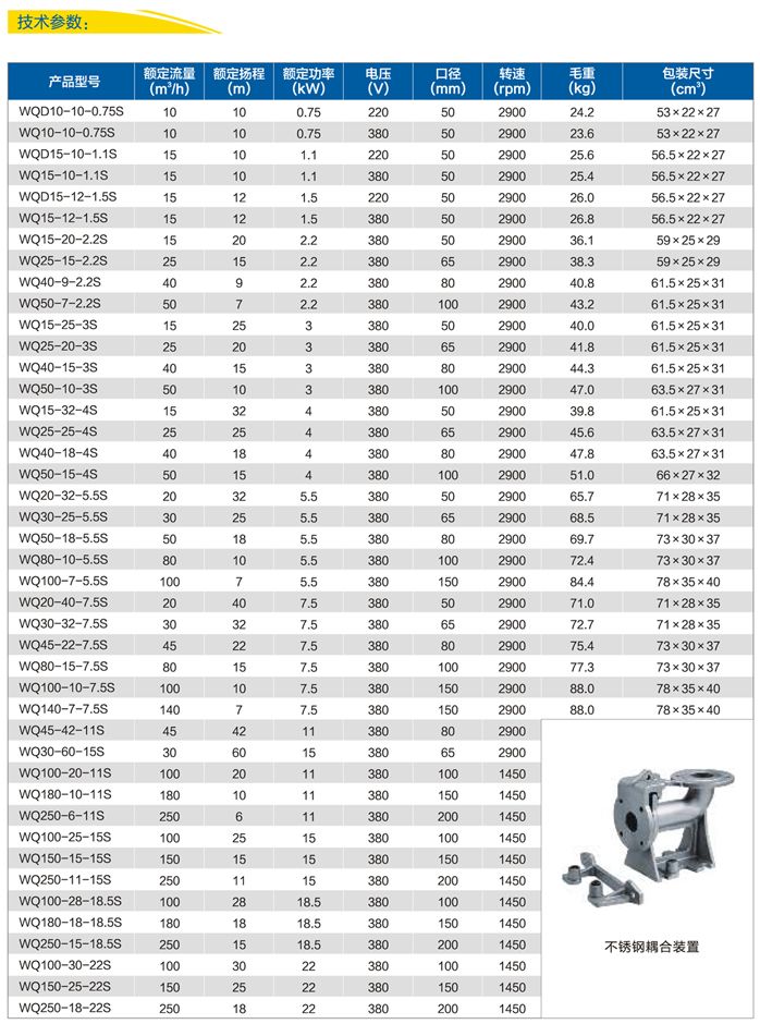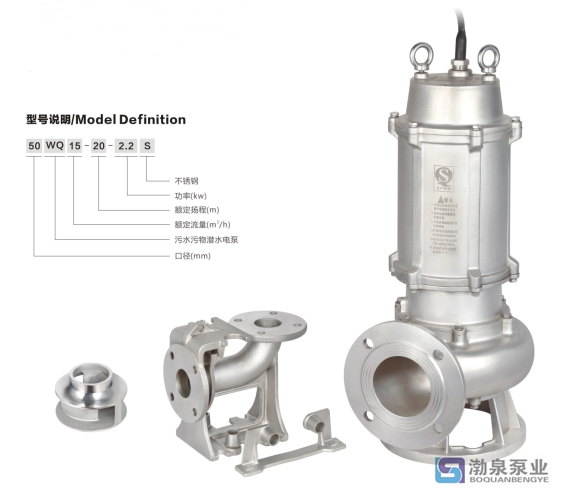 1.國標法蘭WQ(D)-S不銹鋼精密鑄造污水污物潛水電泵采用不銹鋼精密鑄造外殼,具有耐腐蝕,環保型,揚程高,流量大等特點。